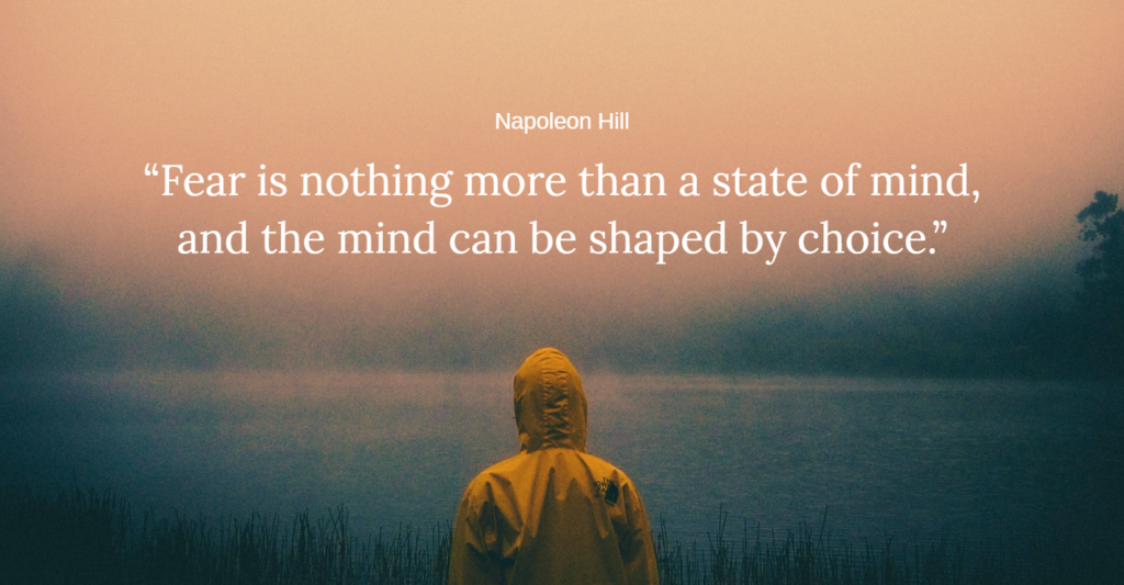 Napoleon Hill identifies six basic fears that hold people back: fear of poverty, fear of criticism, fear of illness, fear of losing love, fear of old age, and fear of death. Then he makes a powerful statement: fear is nothing but a state of mind, and states of mind can be controlled and directed.